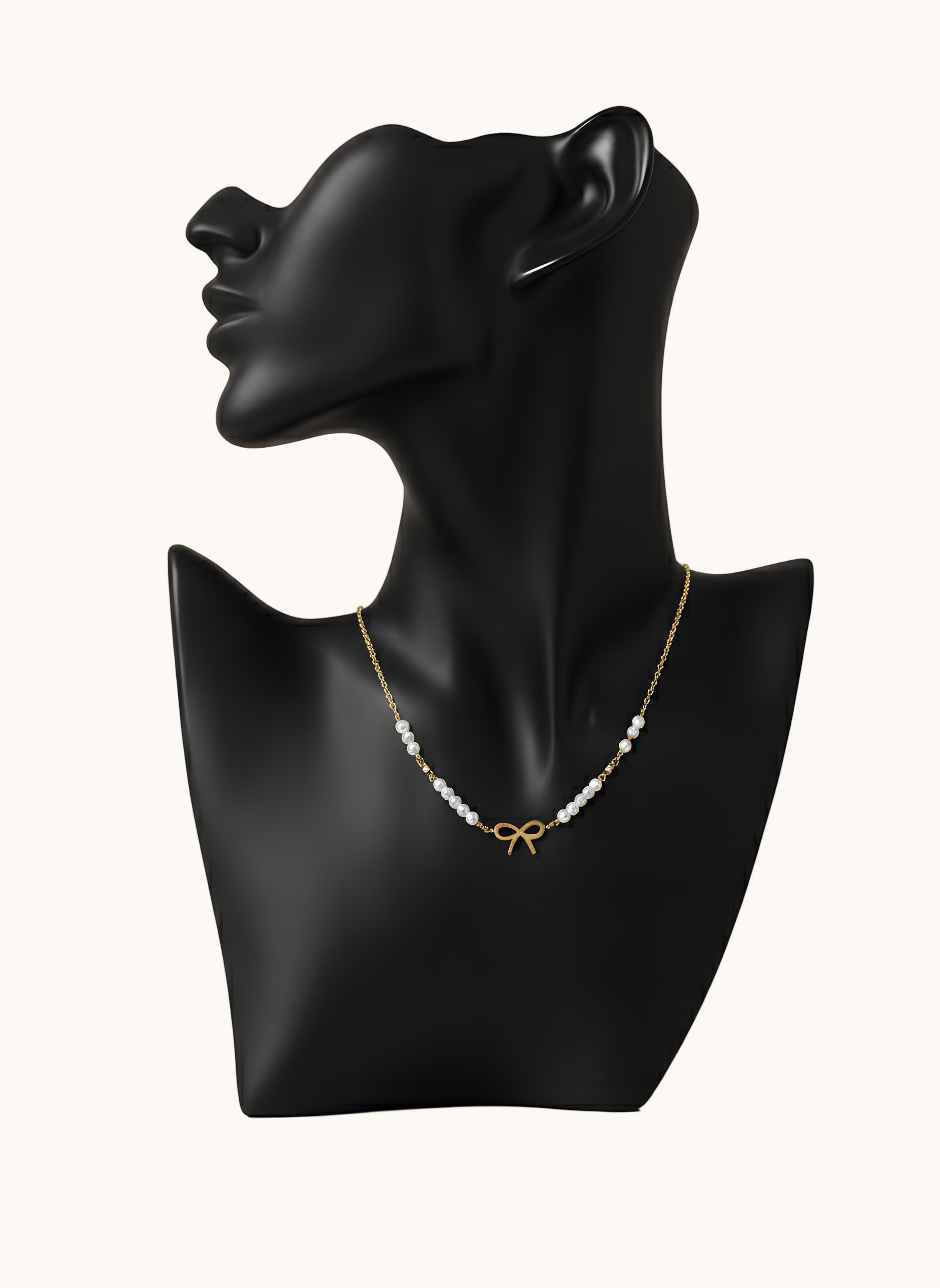 Au milieu des perles se trouve un petit pendentif ou intercalaire en forme de nœud papillon (ou ruban), soulignant l'aspect féminin et espiègle du bijou. Le placement symétrique des perles et du nœud fait de ce collier une pièce chic et romantique, idéale pour un style ras-du-cou ou clavicule.