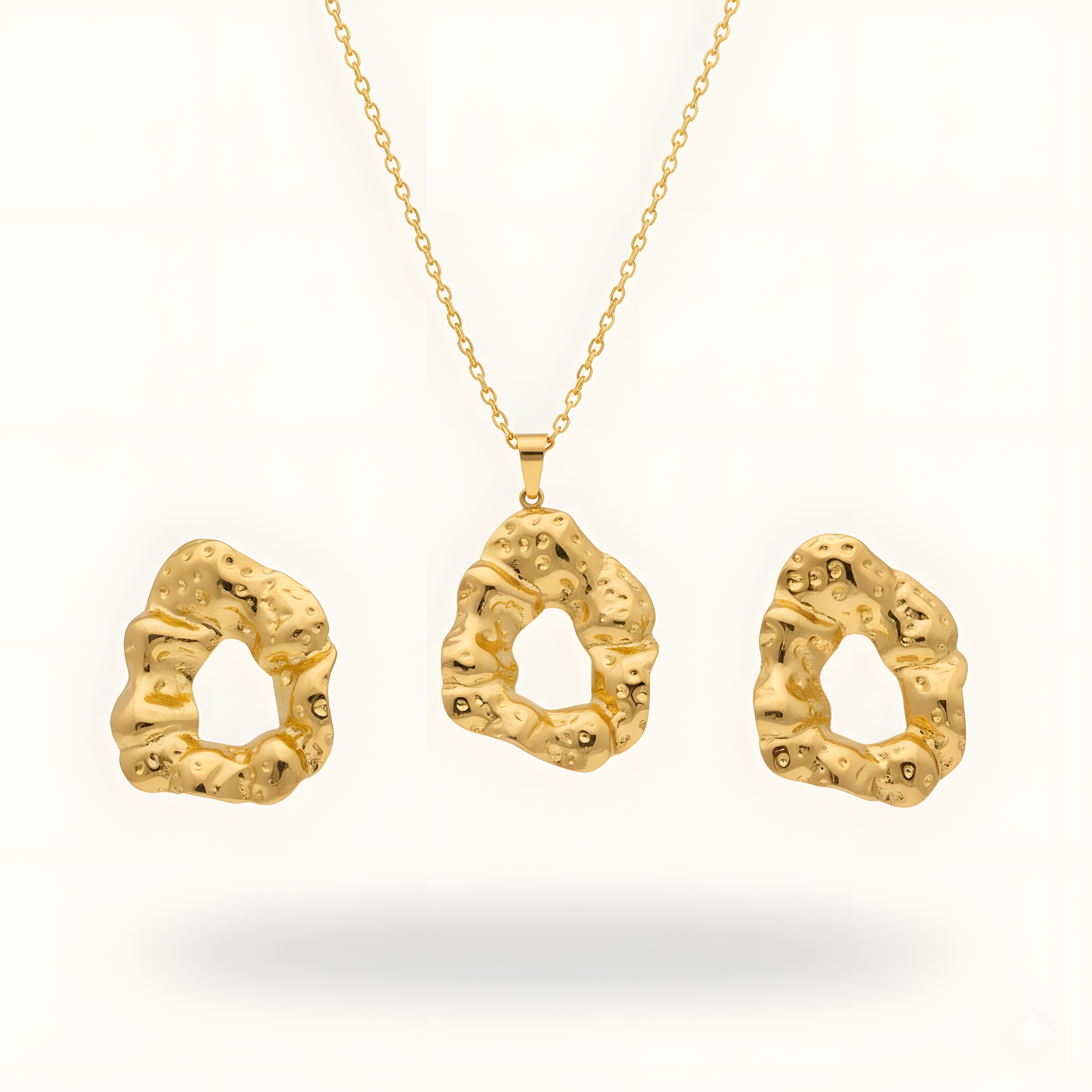 Une parure au style très tendance, souvent appelée "molten" (fondu) ou "lava" (lave). Elle est caractérisée par sa forme irrégulière, ouverte et ses contours asymétriques, avec une surface rugueuse et martelée qui donne l'impression d'un métal sculpté à l'état brut. Le pendentif et les boucles d'oreilles arborent un trou central. Ce style audacieux, suspendu à une chaîne simple, est un choix parfait pour un look artistique, décontracté ou pour ajouter du caractère à une tenue de soirée.